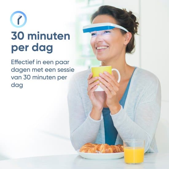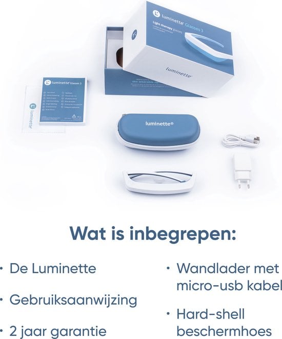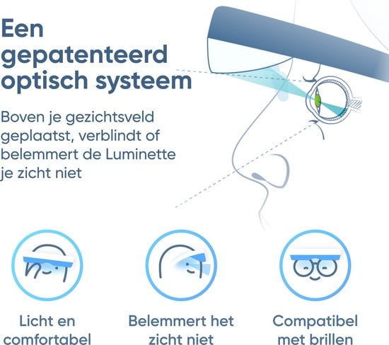 Dankzij de gepatenteerde technologie straalt de Luminette lichttherapiebril wit of blauw licht uit, speciaal gekalibreerd om de positieve effecten van natuurlijk zonlicht te simuleren, zonder uw ogen te belasten of uw dagelijkse activiteiten te verstoren. Het ergonomische en lichte ontwerp maakt het eenvoudig te gebruiken terwijl u vrij kunt bewegen.